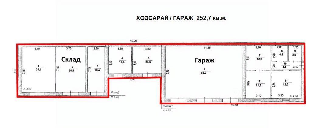 2. Хозяйственный сарай (склад) / гараж общей площадью 252,7 кв.м.. Год постройки: 1964 / 1978. Планировка помещений: кабинетная. Высота потолков: 2,8 м. / 4,25 м. Разрешенная мощность: 10 кВт.