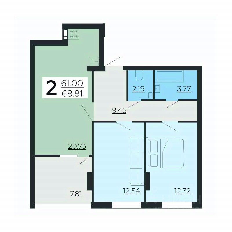 Двухкомнатная квартира 68.81 кв.м. от застройщика ООО СЗ ''АИСТТАУЭР'', расположена по адресу: ул. Нестерова, д. 9 . На 2 этаже, 24 этажного здания. Просторная кухня 20.73 кв.м..