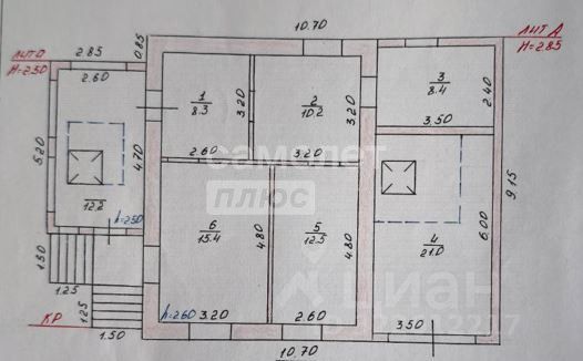 Комнаты: 15,4 и 12,5 кв м, кухня 10,2 кв м, санузел 8,4 кв м, коридор 8,3 кв м, веранда 12,2 кв м с большим сухим подвалом, гараж 21 кв м с подвалом.