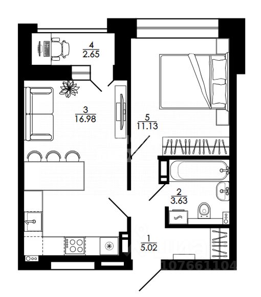 Жилая площадь в квартире 11.13м², кухня-гостиная площадью 16.