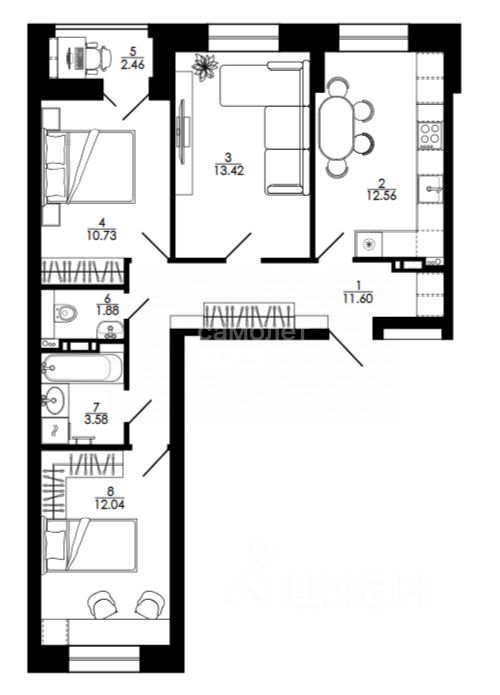 Комнаты по 10,73, 13,42 и 12,04м², кухня-гостиная площадью 12.