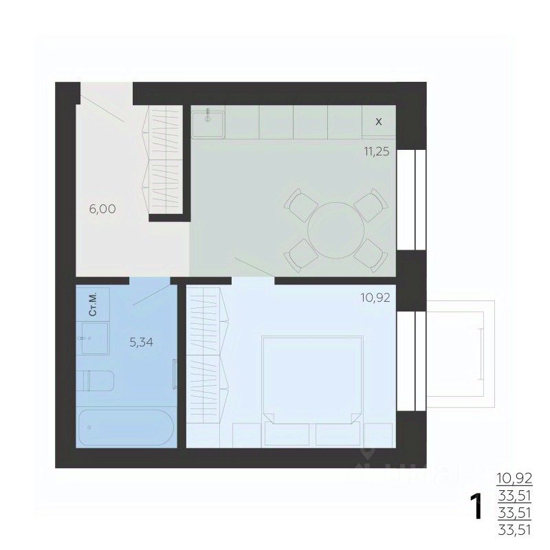 Общая площадь33,51 м2