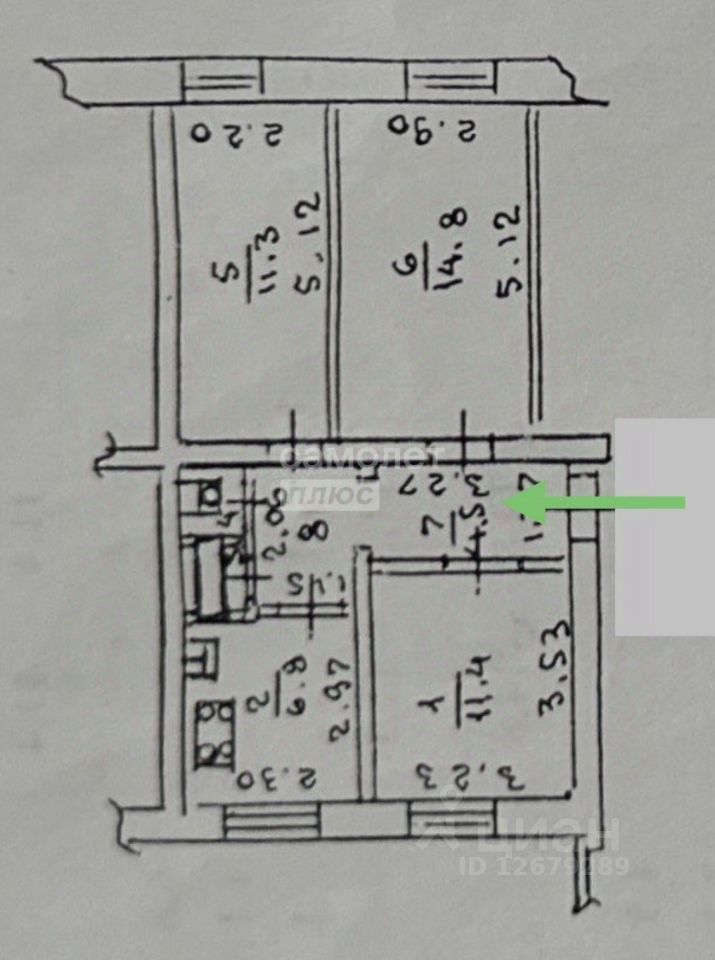 Кухня 6,8 м2 , комнаты 14,8 + 11,4 + 11,3 м2