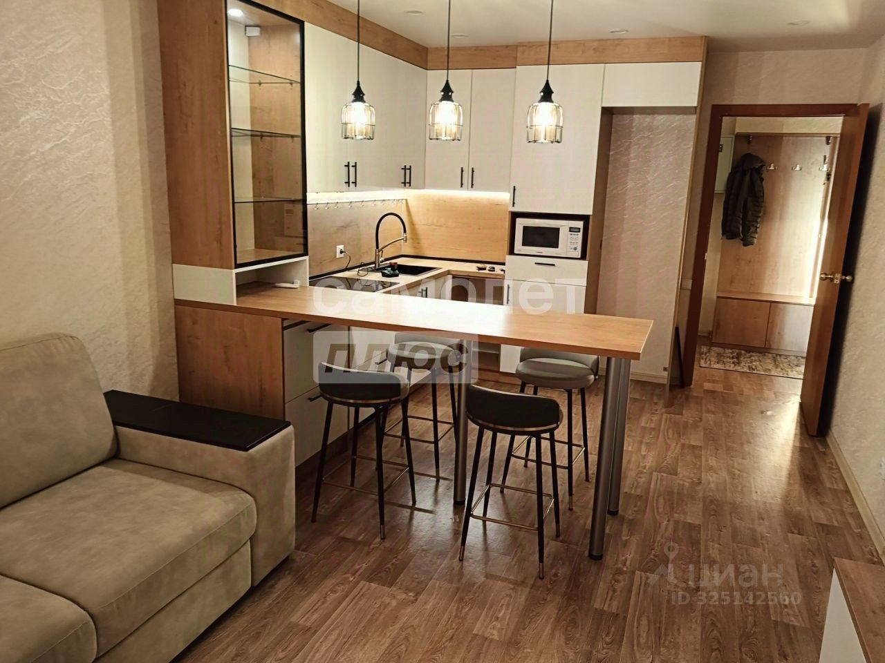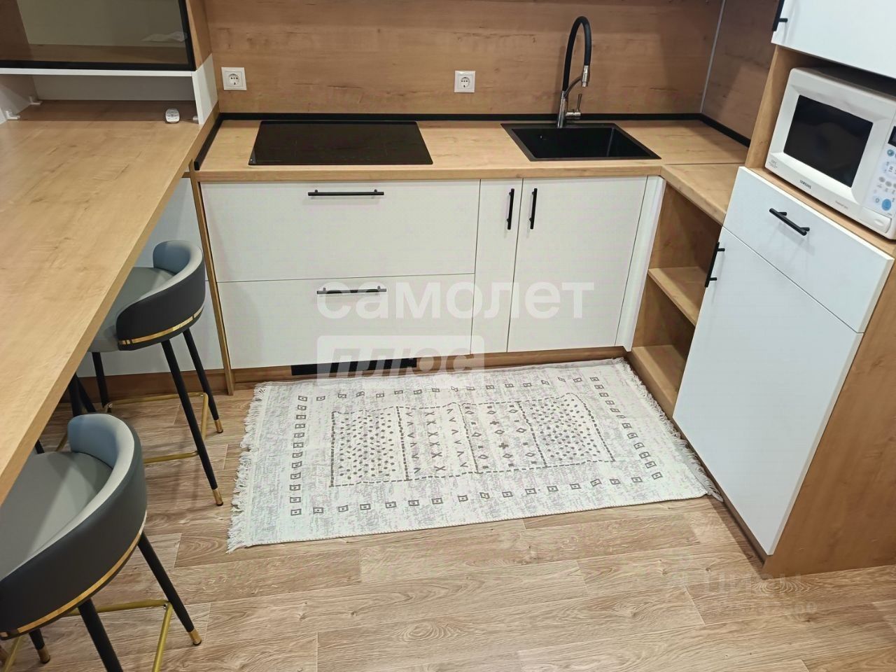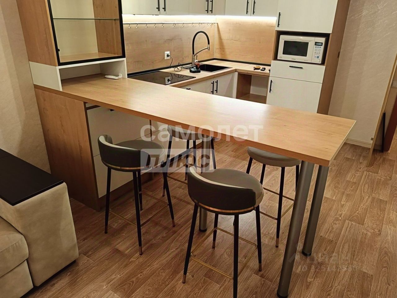 Арт. 127925976 Сдается двухкомнатная квартира-студия. Просторная комната объединена с кухней, зонирование выполнено с помощью барной стойки. Вся мебель новая, изготовлена по индивидуальным замерам. Встроенная техника на кухне также новая. Барная стойка дополнена большим витринным шкафом с подсветкой. Рабочая зона кухни оборудована светодиодной подсветкой. Установлена индукционная плита и мощная вытяжка, выводимая в вентиляционный канал. В комнате имеется тумба под телевизор и комод, а также большой раскладной диван.