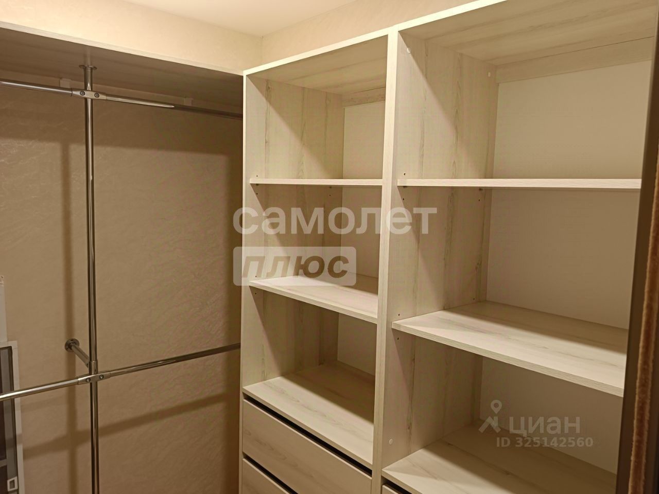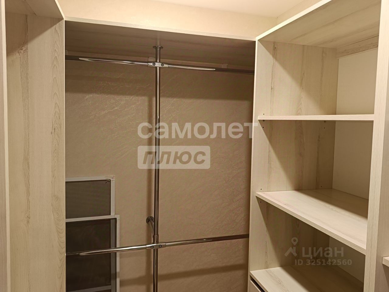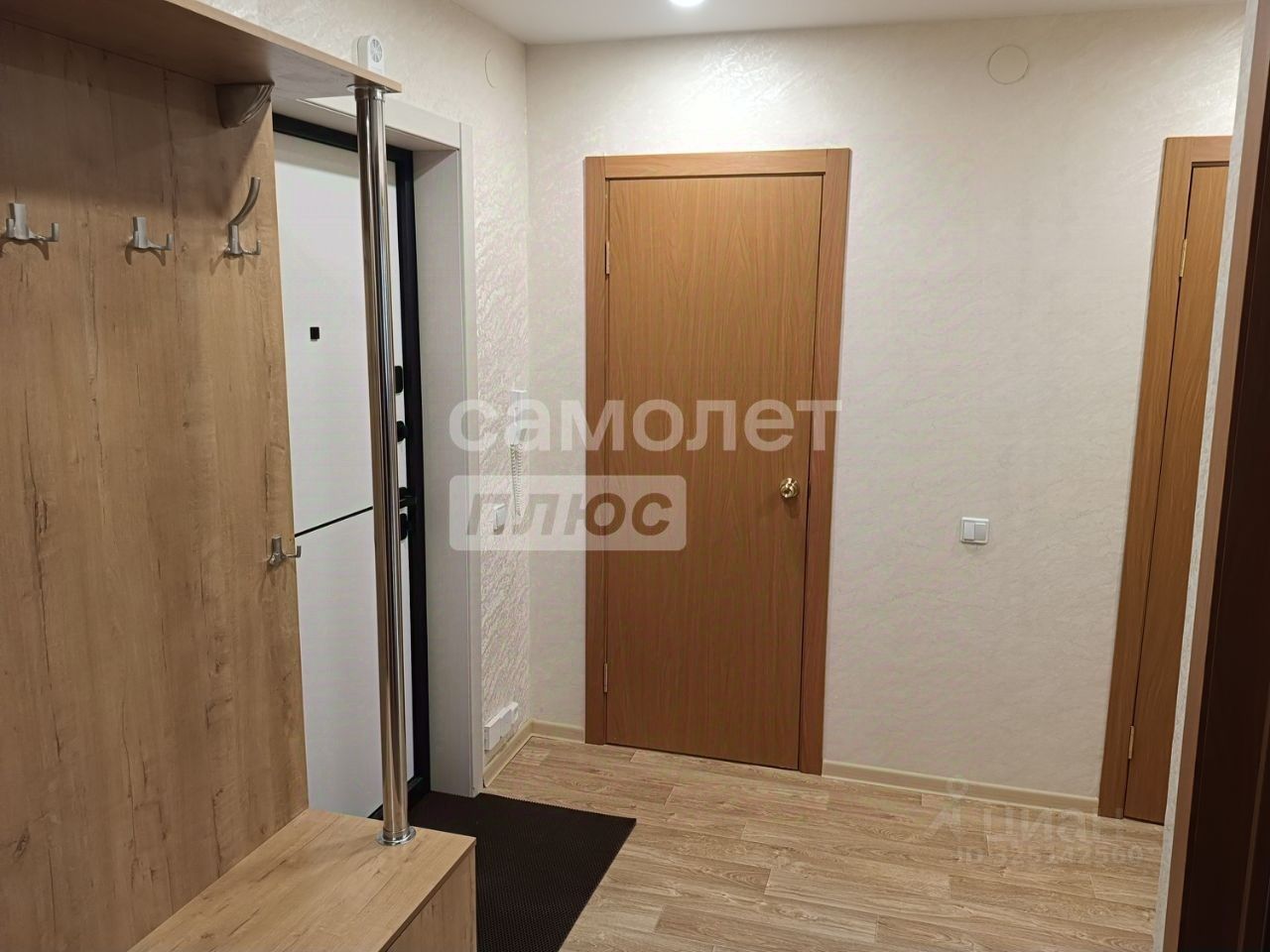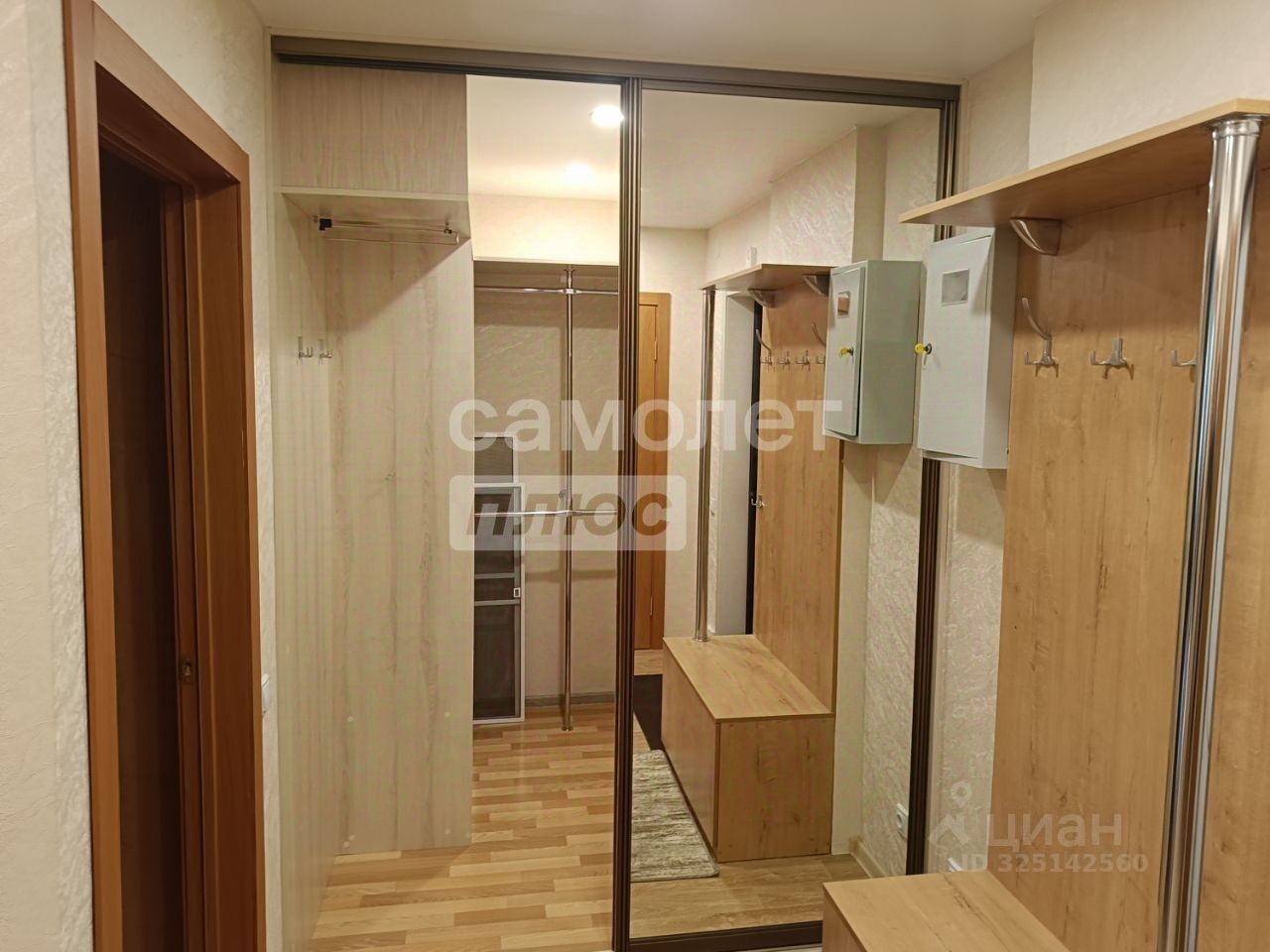 В прихожей расположена большая гардеробная с тремя высокими шкафами, выкатными ящиками и обувницами. Задняя часть гардеробной оборудована системой релингов Джек для размещения большого количества одежды. Над шкафами предусмотрена большая полка для хранения дополнительных вещей. Гардеробная отделена от прихожей двумя зеркальными дверями-купе. Также в прихожей имеется обувница и настенная панель с полкой и крючками для верхней одежды.