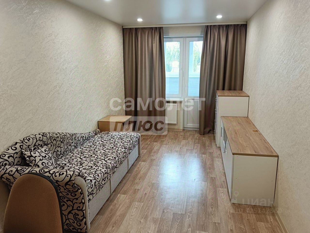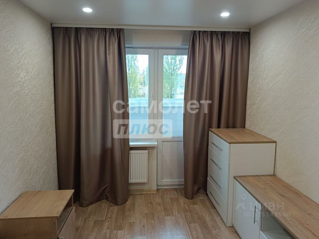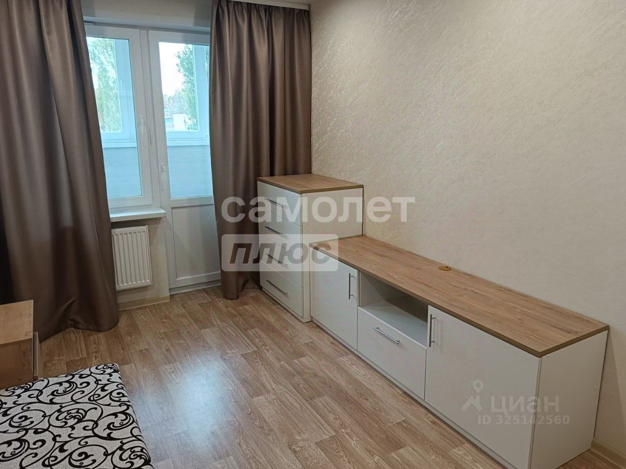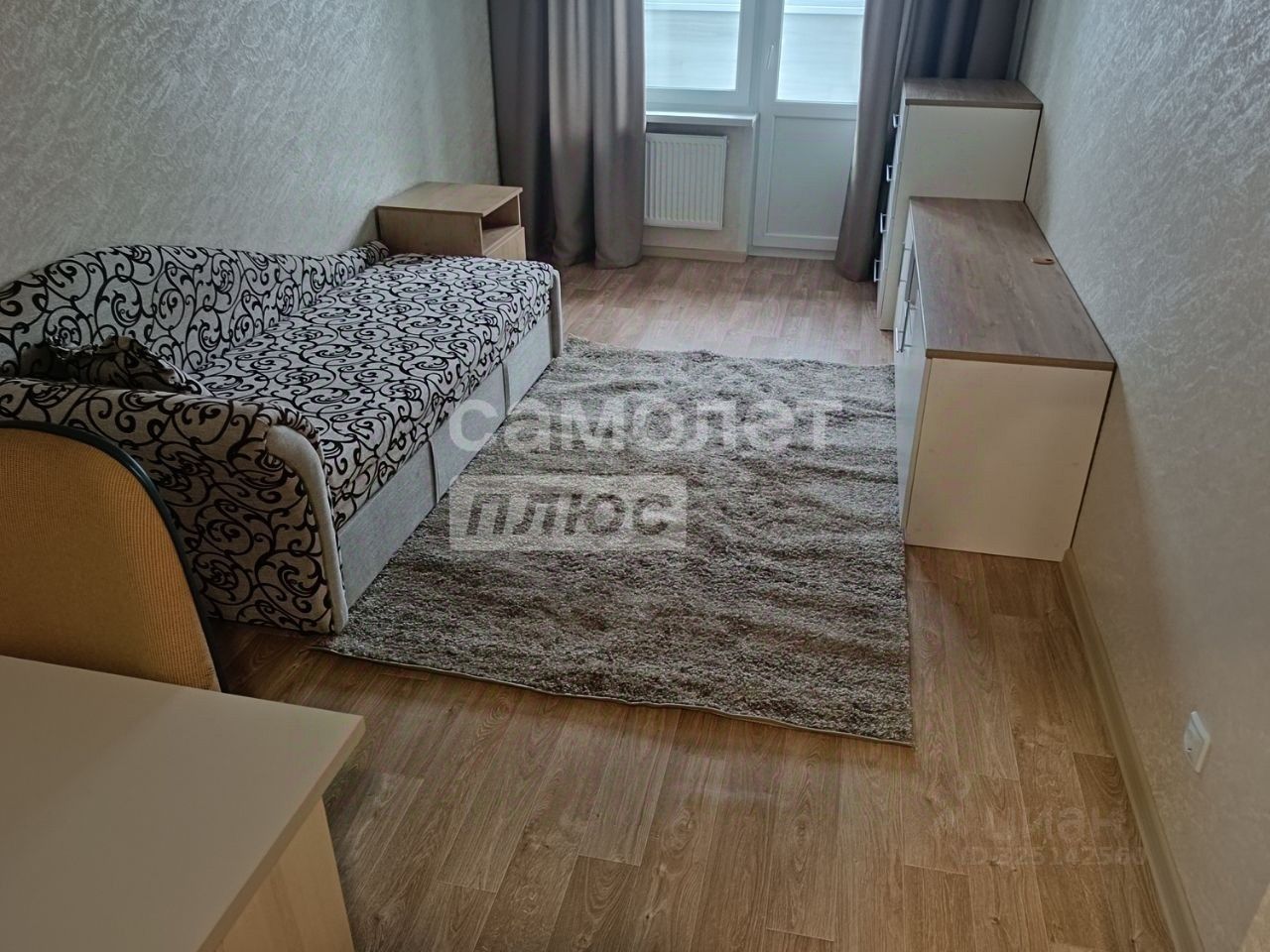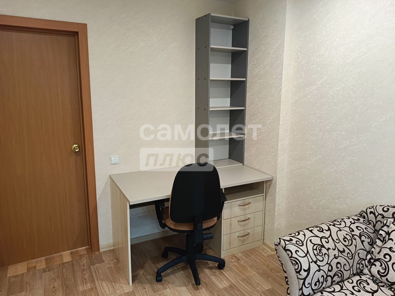 Вторая комната оснащена рабочим столом с выкатными ящиками и надстройкой для документов. Кровать-софа раскладывается на два спальных места, также присутствуют тумба под телевизор и комод, аналогичные тем, что в первой комнате. Из комнаты есть выход на лоджию, отделанную ламинатом и утепленную Урсой, с потолочной сушилкой.