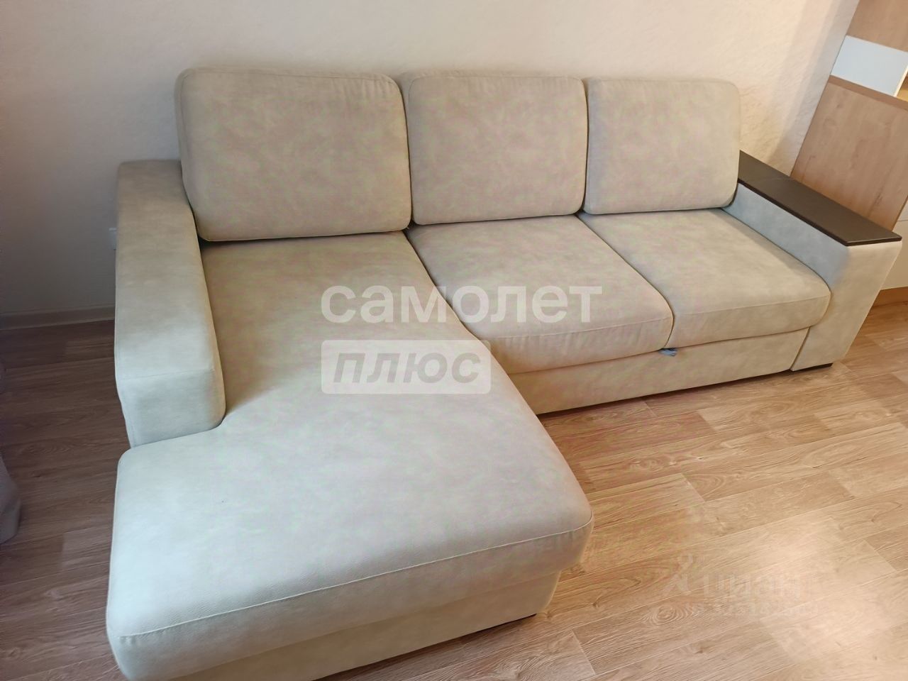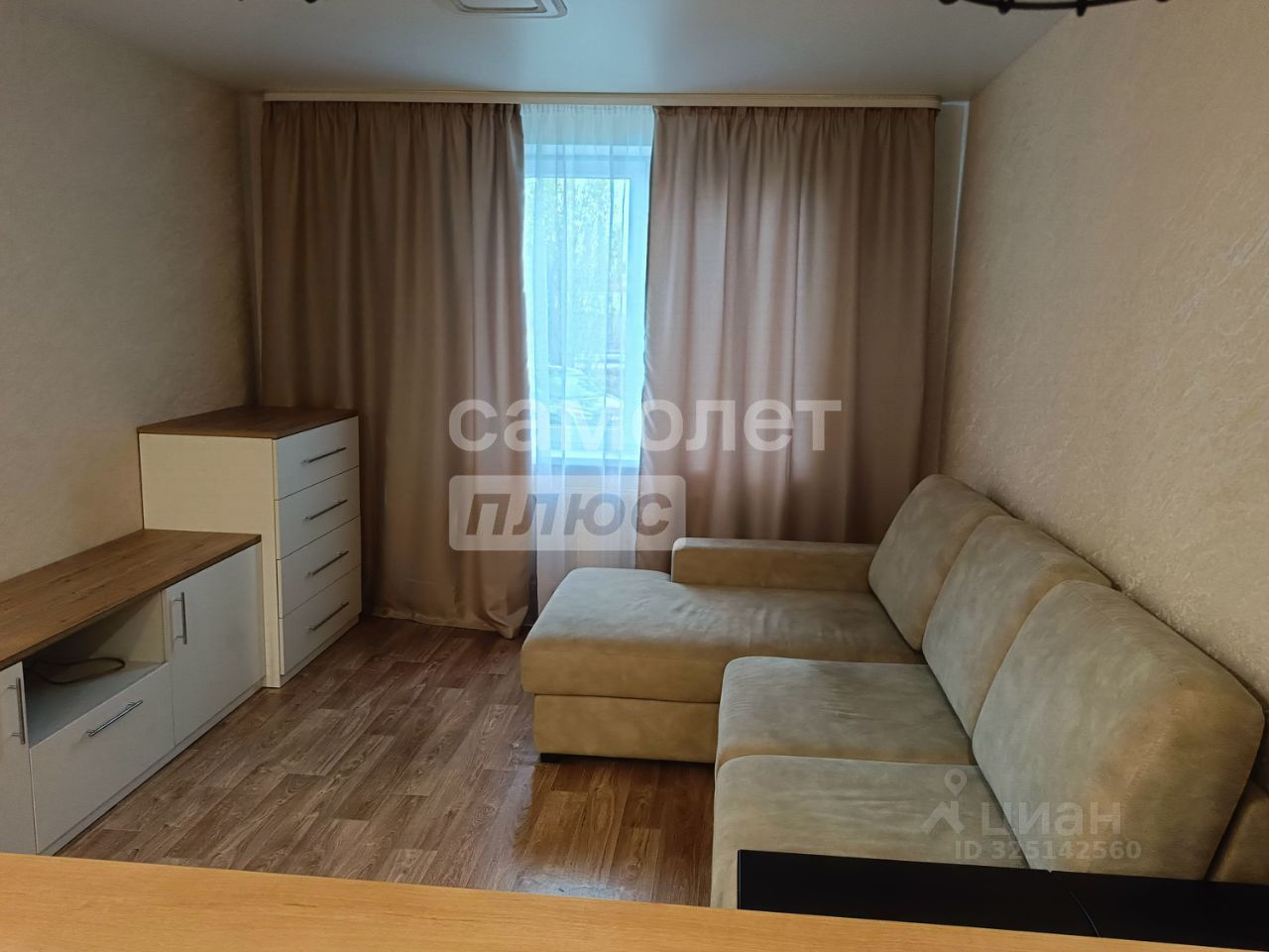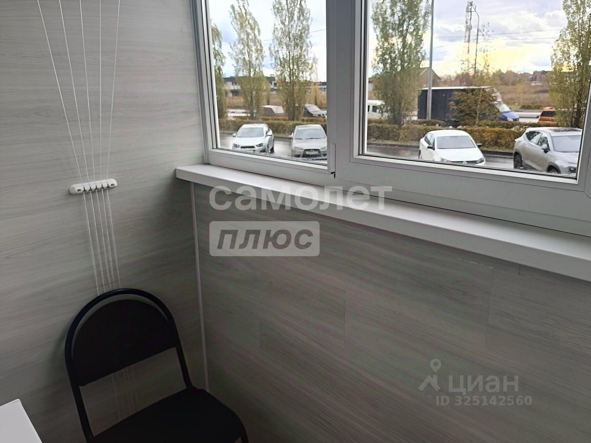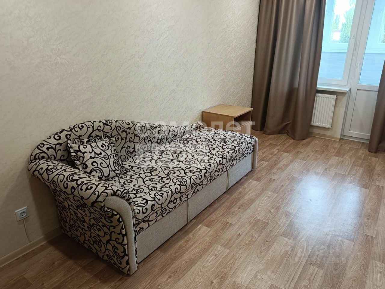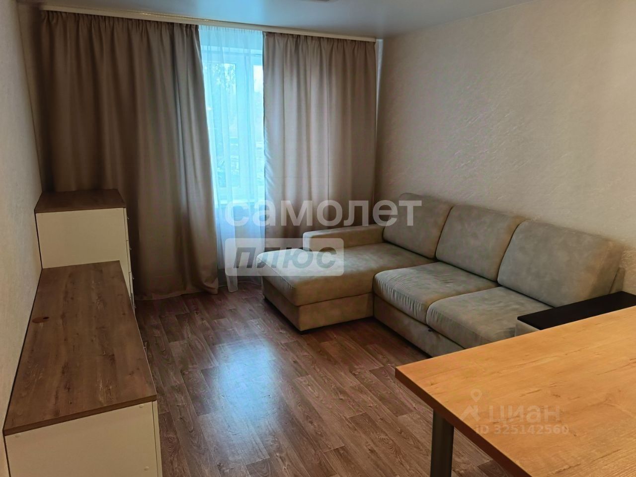Вторая комната оснащена рабочим столом с выкатными ящиками и надстройкой для документов. Кровать-софа раскладывается на два спальных места, также присутствуют тумба под телевизор и комод, аналогичные тем, что в первой комнате. Из комнаты есть выход на лоджию, отделанную ламинатом и утепленную Урсой, с потолочной сушилкой.