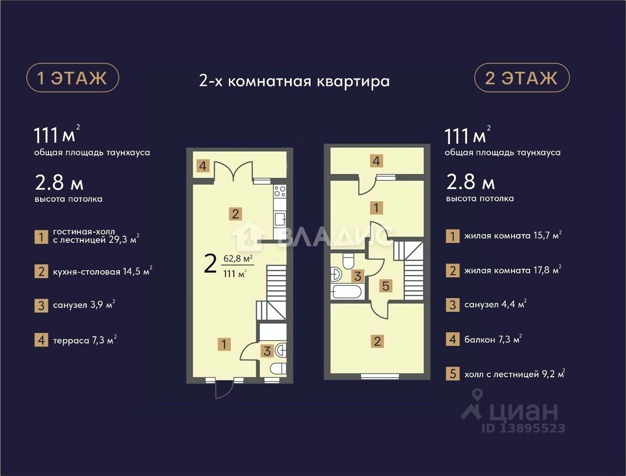 На первом этаже расположена просторная кухня-гостинная с выходом на собственный участок, холл и санузел. На втором этаже санузел и две спальни с выходом на лоджию.