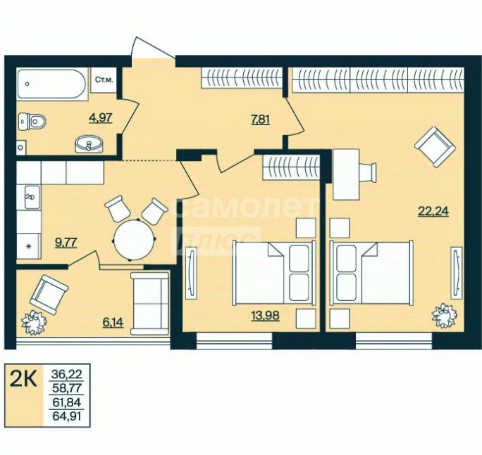 Общая площадь64,91 м2