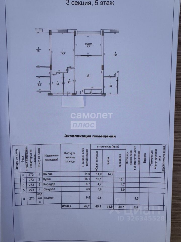 Квартира площадью 49.1 кв.м.: жилая 14.9 кв.м., кухня 16.1 кв.м. Квартира очень теплая.
