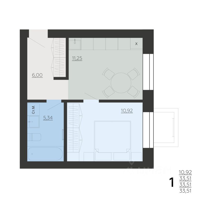 Общая площадь33,51 м2